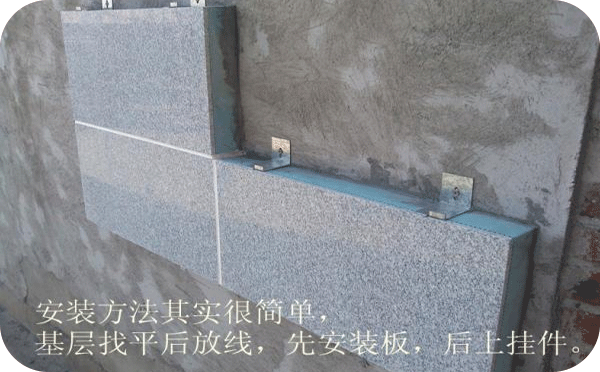 基層前處理和板塊設(shè)定----粘貼成品板----安裝錨固件----分格縫處理----撕膜清理現(xiàn)場